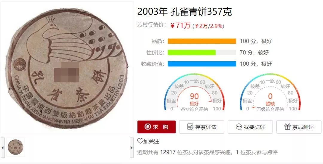 據(jù)市場反饋,如今的2003年的孔雀青餅已達71萬元/件,卻依然一餅難求,成為普洱茶史上不朽的經(jīng)典傳奇!