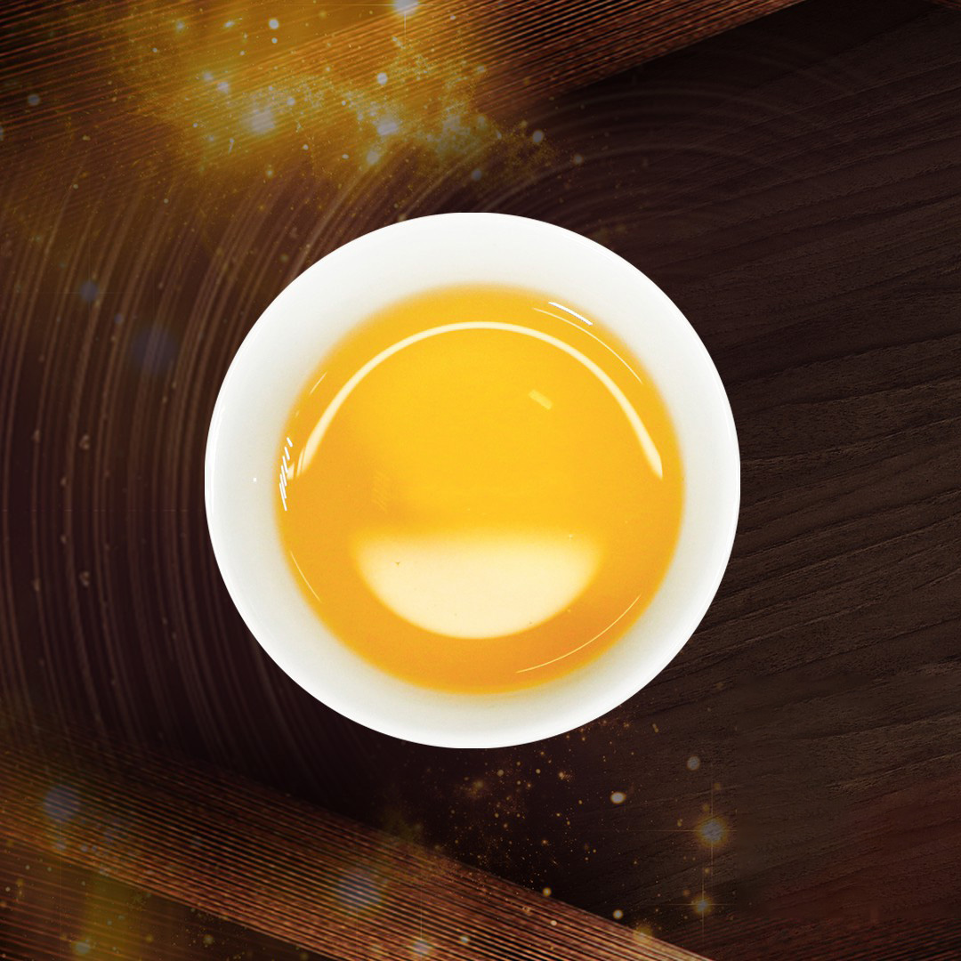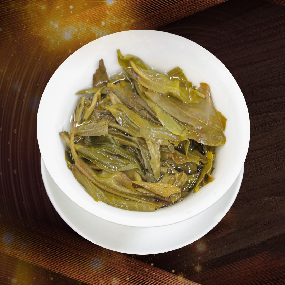 從杯中所見,班章孔雀四星餅王的顏色黃綠油潤,條索細長緊實,芽葉豐腴,清晰顯毫。它的茶湯色澤深豁而明亮,帶有一絲金黃色調,令人感到溫潤可口。