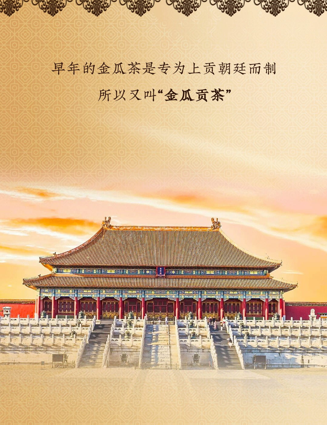 據《本草綱目拾遺》記載,早年的金瓜茶是專門供上貢朝廷使用的,因此又被稱為“金瓜貢茶”。每年僅有極少量產出,并且只有大團型,如人頭式的稱為“人頭茶”,十分稀有?,F今仍存世的陳年普洱茶中,“普洱茶太上皇”就是保存最完好、歷史最悠久的金瓜貢茶之一。