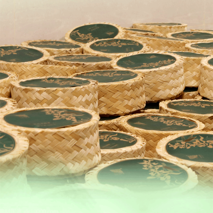 據悉,“蒸蒸日上”散熟的制作過程十分復雜,待熟茶渥堆發酵完成后稱量好放入鋪墊滿甜竹葉的竹籃蒸籠內,高溫蒸制25-30分鐘讓甜竹與熟茶的香氣滋味相融合形成獨特的竹香熟茶風味,接下來便是專業烘房干燥。經過精密的加工,甜竹葉牢牢包裹著熟茶,形成條索烏褐勻齊,芽葉身骨重實的顏值極高的茶葉。